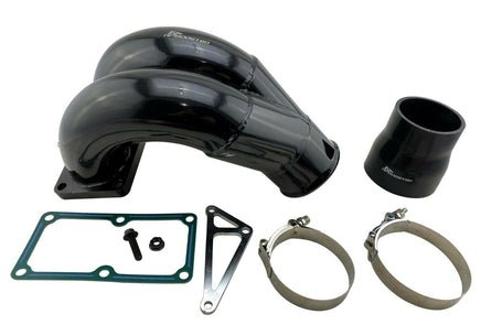 This Twin Ram design will provide a 49% increase in flow over the factory manifold Inlet Elbow. This is a vast improvement over the stock manifold you can expect quicker Turbo Spool, Lower EGT's, and less over all strain on Motor.