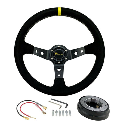 JDM 350mm / 13.8" Deep Dished Universal Racing Suede Alloy Steering Waheel w/ Yellow Center Mark & Low Profile Quick Release Hub Kit